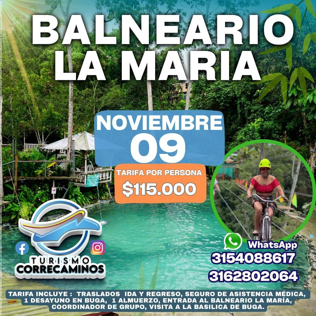 - 9:30am aproximadamente nos dirigimos al balneario la María, ubicado en el corregimiento de la María, para disfrutar de sus aguas naturales y de actividades semi extremas con las que cuenta este lugar, costo adicional de estas actividades y se cancelan directamente en el balneario.