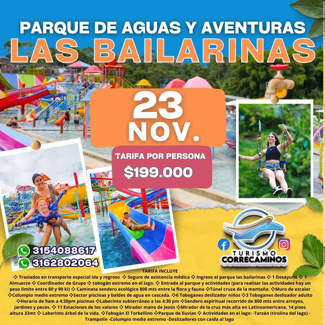 - Traslados en transporte especial ida y regreso ❖ Seguro de asistencia médica ❖ Ingreso al parque las bailarinas ❖ 1 Desayuno ❖ 1 Almuerzo ❖ Coordinador de Grupo ❖ tobogán extremo en el lago. ❖ Entrada al parque y actividades (para realizar las actividades hay un peso límite entre 80 y 90 kl) ❖ Caminata sendero ecológico 800 mts entre la flora y fauna ❖Túnel cruce de la montaña. ❖Muro de escalar ❖Columpio medio extremo ❖Sector piscinas y baldes de agua en cascada. ❖6 Toboganes deslizador niños ❖3 Toboganes deslizador adulto ❖Horario de 9am a 4:30pm piscinas ❖Laberinto subterráneo a las 4:30 pm ❖Sendero espiritual recorrido de 800 mts entre arroyos, jardines y peces. ❖ 11 Estaciones de los valores ❖ Mirador mano de Jesús ❖Mirador de la cruz más alta en Latinoamericana, 14 pisos altura 33mt ❖ Laberinto árbol de la vida. ❖Tobogán El Torbellino ❖Parque de lluvias ❖ Actividades en el lago: -Tarzán (tirolina del lago) -Trampolín -Columpio medio extremo -Deslizadores con caída al lago